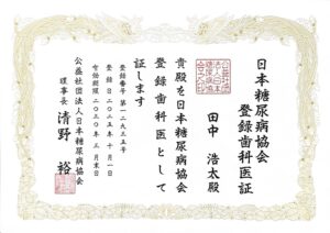 また、当院院長田中浩太は日本歯周病学会認定医であり、日本糖尿病協会の登録歯科医です。糖尿病と口腔の関係を理解し、医科歯科連携の重要性を意識した診療体制を整えていることも、当院の特徴のひとつです。